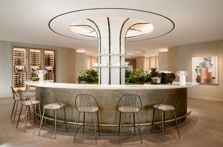 走进香港最新的AP House,通过高耸双门入口时即能感受到爱彼文化中的高雅气质,接着很快会注意到圆形的手表展厅,它的周围伴随波浪形的洞石大墙,凹陷处巧妙安排展示柜,让人可以在此好好欣赏AUDEMARS PIGUET精挑细选的时计杰作。位处室内中心位置的是「雅竹吧檯」,其由中国文化中象徵高雅、虚心、有节的竹子发想,透过由吧檯中央支柱往上延伸至天花板的竹类造型装饰,搭配周围精巧的布置的植栽,在热闹的都市中独树一帜地包容进大自然的绿意,而这种氛围也并非只限于吧檯空间,一路往VIP区、餐厅等处同样都可以清楚感受到现代建筑与自然和谐共处的设计巧思。得利于大面积的落地窗设计,因此室内得以享有充分的天然採光,在白天时即使不开灯还是能感受到明亮温暖的光线照射其中。