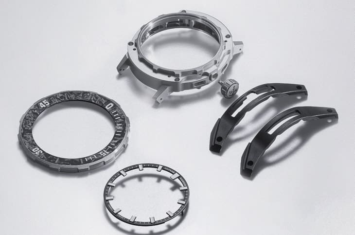 为了达到如此惊人的减重效果,雅典表特地结合高科技材质与大范围镂空设计。Diver Air的超轻重量主要归功于其模组化表壳结构以及重新设计的机芯。44mm的表壳厚度为14.7mm,保留潜水表需承受水压的厚实结构之餘,表壳中层採用90%回收再造的钛金属,有助于确保200米的防水性能。表壳侧面包括表耳零件,採用了名为Nylo®-Foil的复合材质,其由60%的回收渔网制成的聚醯胺纤维(Nylo®)和40%的升级再造碳纤维组成。至于单向旋转表圈又是採用CarbonFoil碳纤维锻造而成,此处的碳纤维也是100%回收自IMOCA级帆船,由此可知ULYSSE NARDIN并非一味追求手表的轻量化,也同样重视对环境的友善性,善加利用原本被视为废弃物的材质,体现其注重环保议题的品牌精神。