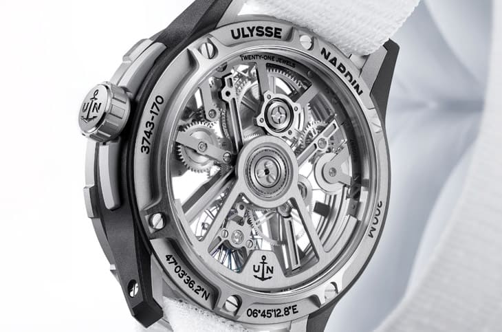 手表搭载雅典表全新设计的UN-374自动机芯,这枚机芯是在既有的UN-372机芯基础上进行大幅度的轻量化改造。机芯的桥板採用轻盈且坚固的钛金属制成,与传统的黄铜材质相较也是一大突破,并经过精密的镂空处理,呈现出潜水X系列标志性的X形桥板造型。主发条盒的上桥板被移除,形成了飞行式结构,但依然保有长达90小时的动力储存。机芯的主要部件,如桥板和主夹板,採用了90%的回收再造钛金属,此外雅典表身为表坛硅材质技术的先驱,其擒纵机构还是继续採用再生硅晶片零件制作,具备优异的抗磁性。值得一提的是,儘管经过极度的镂空、单纯机芯重量仅7克,但是UN-374机芯经过实测依然能够承受高达5000g的冲击力,然而雅典表也不愿意为了减重目的而逕行把上链机制改为手动上链,因为若要符合专业潜水表标准,自动上链原本就是一项必备基本元素,在确保潜水表的基础架构下,尽力让手表变得轻盈,这是ULYSSE NARDIN在理想与现实中找到的完美平衡。