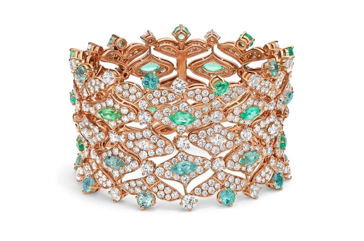 ▲Mediterranea系列Paraiba Tourmaline Mosaic顶级玫瑰金帕拉伊巴碧璽与钻石手环。