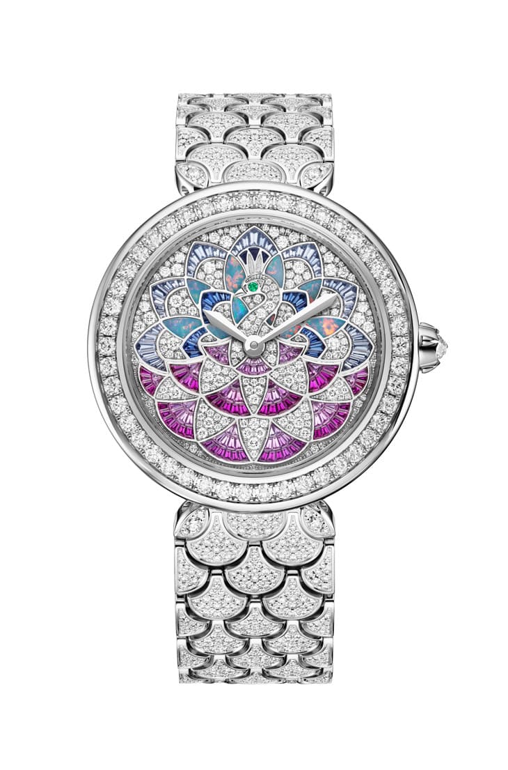 再来是Divas' Dream Peacock Mosaics腕表,把罗马古迹的马赛克地砖美学直接搬进腕间。孔雀羽毛化作扇形图腾,藉由粉红刚玉、蛋白石、蓝宝石等珍贵宝石描绘出华丽纹理,钻石雪花镶嵌则包围整个白金表壳与表链,总重超过8克拉,细节精致到彷彿在画微型壁画。机芯方面也毫不马虎,搭载宝格丽自制BVL 191自动机芯,实用且稳定。