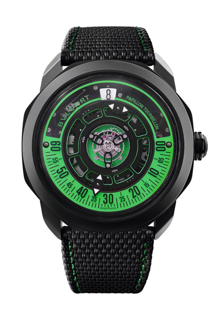 DLC钛金属材质/BVL348手动上链机芯/跳时、蝴蝶指针分显示/陀飞轮装置/蓝宝石水晶镜面/防水50米/表径44mm