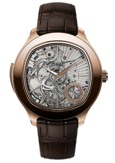 ▲ 伯爵Emperador Coussin 超薄叁问手表,18K玫瑰金,防水表壳,蓝宝石水晶透明表面,蓝宝石玻璃底盖。建议售价 NTD,250,000元