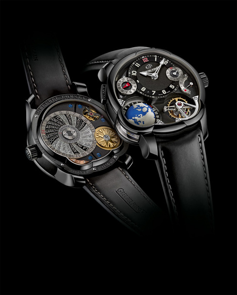 ▲ GREUBEL FORSEY以真空处理的ADLC碳膜加工技术为表壳加上一层深黑色的碳膜,GMT Black手表将限量制作仅22枚。