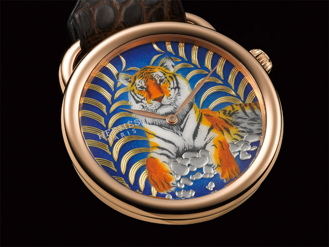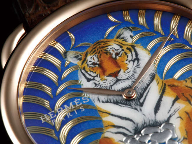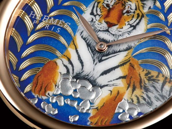 爱马仕近年不断融匯各式装饰工艺入表,甚至开放客制化大门催生绝无仅有的稀世珍品;前不久品牌便刚完成一只以「王者之虎」丝巾为摹本的怀表作品,透过珐琅与金雕工艺师联手出击,激盪出虎虎生风的传神景致。