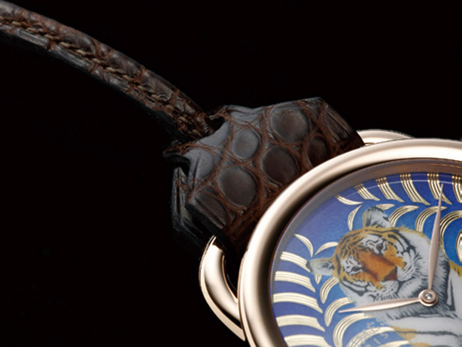 珐琅工艺师不只将王者之虎丝巾上的主角顺利搬入怀表面盘,透过细腻笔触及对珐琅釉彩的精确掌握,更让画作中的猛虎释放不怒而威的气势。