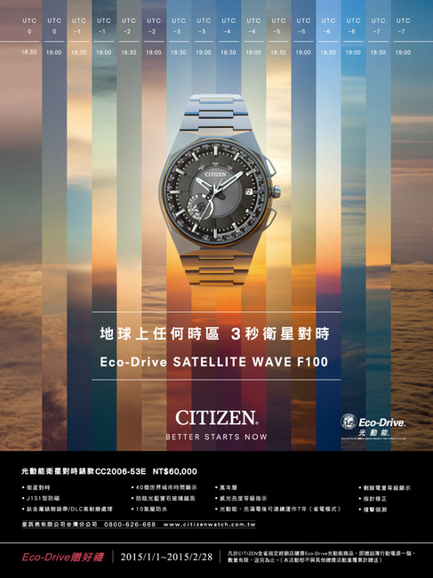 太空时代已经来临,就在CITIZEN为你打造的新一代的光动能卫星对时手表 CC2006-53E所带来的极致科技。无论你身处在世界的哪一个角落,只要轻轻按下按键,CITIZEN光动能卫星对时手表F100机芯(Eco-Drive SATELLITE WAVE F100)就能在3秒*为你校正到正确时间。CITIZEN从1930年创立至今,不断地在挑战、改革与创新,最为专业的制表品牌,从率先引进电波定时到开发具有革命性的光动能技术,及至现今的新一代卫星定时技术,都是业界的前卫先驱。每一个创新的技术都是为了能将你我的生活品质更加提升,在CITIZEN光动能卫星对时手表 CC2006-53E手表之中所搭载的F100机芯可藉由距离地球20,000公里的导航卫星,捕捉卫星发出的信号进行手表时间和日期的校对,而以全球40时区设定的人性化设计,让你无论身在地求何方都能精准掌握正确时刻。