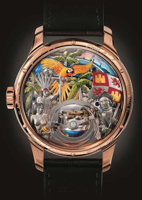 ▲ Academy Christophe Colomb Hurricane Grand Voyage II 手表细腻的手工鐫刻及层次鲜明的色彩,重现哥伦布发现新大陆的壮举。