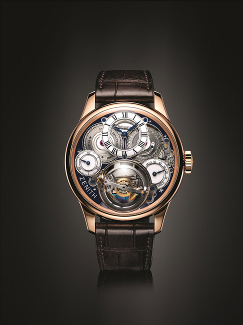 ZENITH将这款手表的面盘一面视为展示制表成就的舞台,採用鏤空设计,令叁项充满强劲动力的机械装置一览无遗:包括芝麻链传动系统的发条盒(位于10时半至1时半之间、陀螺仪重力控制系统和高振频调校机制(位于6时位置)。这一极具立体感的造型不仅是美学探索的完美结晶,更与 ZENITH传承至今的精美大师工艺相得益彰。叁个金质小表盘(时/分盘位于12时位置,小秒针位于9时位置,动力储存显示则位于4时位置鐫刻精美雕纹,随后饰以白色珐琅,蓝钢指针和螺丝相映成趣,遵循制表工艺之伟大传统 。夹板以全手工雕凿,以突显浮雕ZENITH和星星标誌,随后在凹雕部分填入夜蓝色涂漆。重力控制系统的平衡块同样採用富有诗意的精致装饰,採用纯手工微绘工艺再现南半球星空图。