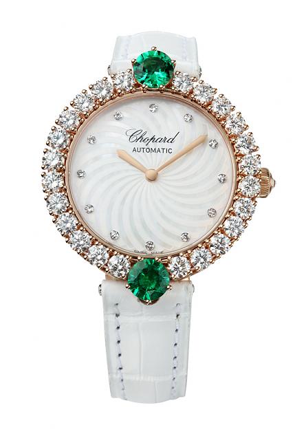 ▲ 萧邦L’heure Du Diamant系列自动上链手表,18K玫瑰金表壳镶嵌总重4.05克拉钻石与2颗总重2.19克拉祖母绿。参考价:NT,387,000