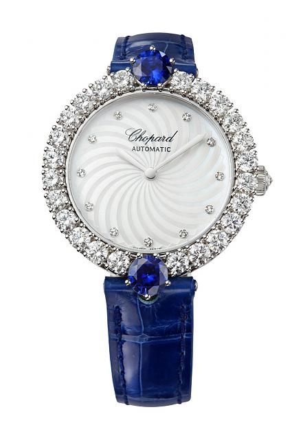 ▲ 萧邦L’heure Du Diamant系列自动上链手表,18K白金表壳镶嵌总重4.02克拉钻石与2颗总重2.62克拉蓝宝石。参考价:NT,757,000