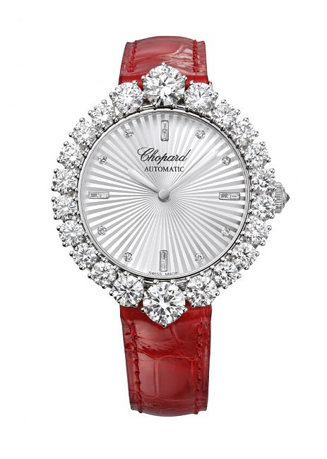 ▲ 萧邦L’heure Du Diamant系列自动上链手表,18K白金表壳镶嵌总重4.05克拉钻石与2颗总重2.02克拉钻石。参考价:NT$,387,000