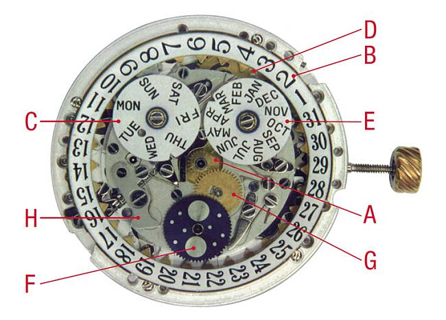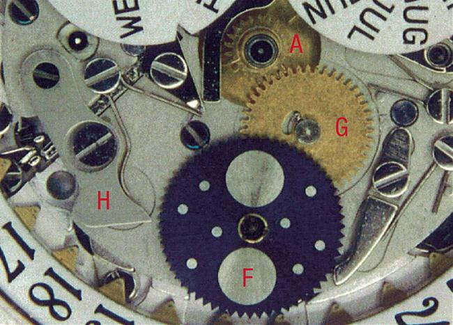各品牌虽然都有同样功能的表款,但设计方式多少有些不同,在此我们以DUNHILL计时码表搭载的ZENITH 410机芯作为示范机种,410是一个指标性结构,应是其中较为复杂的一种。此机芯的运作方式是由时轮A带动位于下方的连动拨桿(在下层结构),带动日期盘B及星期盘C,再由日历盘B的3的数字下方有一突出较长的的位置D,带动月份盘E。而月相盘F则由时轮A透过中间轮G带动;而H则为月相快调装置。此功能月份需靠快速转动日历盘来带动月份盘,但因为日历盘转动速度极快,并不会造成调校月份的不便。