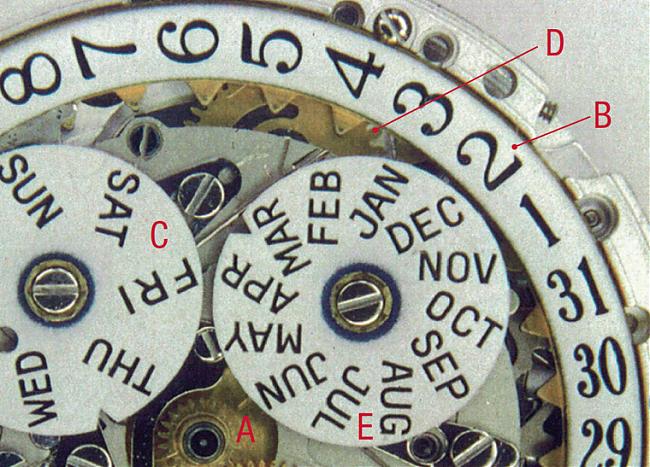 时轮A带动位于下方的连动拨桿,带动日期盘B及星期盘C,再由日历盘B下方的D,带动月份盘E。