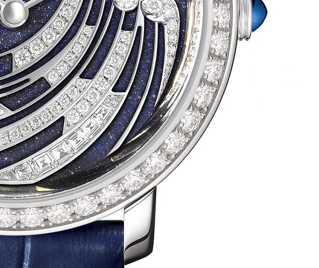 Vague de Lumière手表取材于精致唯美的日本浮世绘作品「神奈川冲浪裡」,擷取1910年Vague头饰设计概念,以多种材质——白金、钻石及砂金石,重新詮释出葛饰北斋的波澜壮阔,延续着BOUCHERON宝诗龙与艺术的不解情缘。面盘上的砂金玻璃赋予了这款时计以湛蓝色泽和优雅格调,仿佛在不断流逝的时光中探入时间深海般幽静深邃,也仿佛在腕间望见星斗满布的浩淼苍穹。Vague de Lumière手表以如此鲜明色彩,凸显着BOUCHERON宝诗龙自然主义的现代精神。