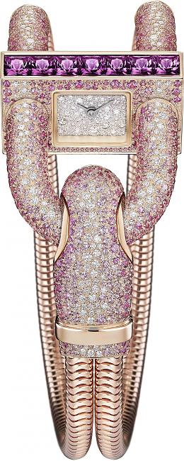 全新款式彰显手表光芒流泻的珠宝面貌。除表壳顶端饰以公主式切割 钻石外,表壳、面盘及表扣整体以雪花式镶嵌铺镶圆钻,绽放炫亮华彩。如此瑰丽、含蓄而细致的设计,衬以白K金双圈圆柱形表链,更觉闪烁耀目。Cadenas Pavée全铺镶钻石手表另备有玫瑰金款式,镶嵌粉红刚玉及钻石,闪耀柔和婉约的光辉。Cadenas Pavée Saphirs Roses Bracelet Or金质表链搭配配全铺镶粉红刚玉手表,于表壳及表扣饰有钻石及渐层粉红刚玉。