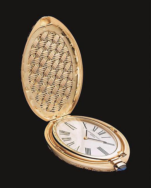 这枚18K金质怀表于1971年问世,横向椭圆造型的设计与装饰已至完美。这枚时计因其游猎型表殻闻名,银白色表盘加以别致的罗马数字时标,后者在3点和9点位置规格增大,以凸显椭圆型的造型美感。
