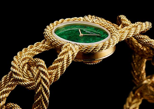 黄金铸造技术因这枚18K黄金手表进入全新的发展纪元,细节精湛的索状螺旋镶缀编织的椭圆造型,让人眼前一亮。横向椭圆表盘由石榴石家族的绿色钙铝榴石所打造,表圈一如表带採用了索状螺旋镶缀设计。