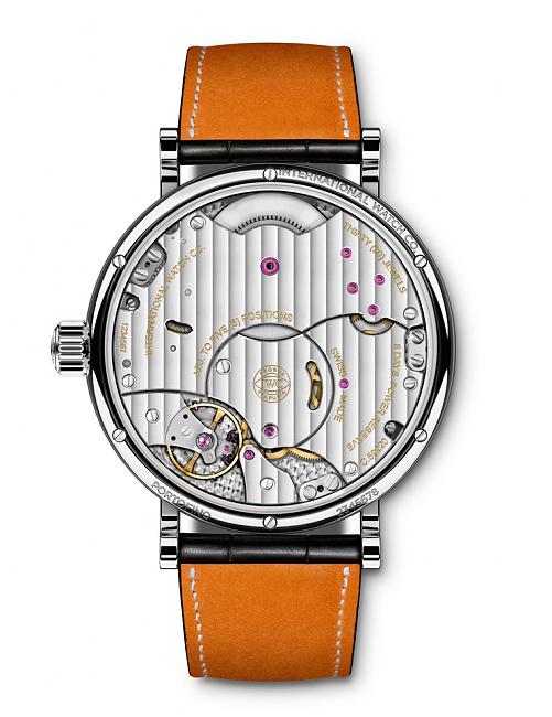 借助大型日期、星期与动力储备显示,以及位于「6点鐘」位置的小秒针,表盘为佩戴者提供眾多便捷的功能显示。儘管功能眾多,但这一全新家族成员依然保留了柏涛菲诺系列固 有的优雅特性与低调外观。月份透过位于「12点鐘」位置处 的大型数字予以显示,方便读取。而日期显示则来自两个相互协调的显示圆盘之间的完美搭配。其中一个显示盘以0到3之 间的数字表示十位数,而第二个显示盘则由0到9之间的数字 表示个位数。两个显示盘的完美同步这项绝技由IWC万国表的59220型机芯完成。附加的星期显示与日期转换相连。两 个重叠的弹性推进指针在日间从发条盒汲取能量。午夜时分,两个推进指针已获取足够能量,一方面可以推进日期, 另一方面可以向前移动一颗七角星,这颗星又推动指针跳跃 至下一个工作日。八日动力储备机芯可确保整整192小时的精确走时,无需另外上链;之后佩戴者才需透过旋转表冠上链,为其输入新的动力。什麼时候该上链可以从表盘上的动力储备显示读取。现代感十足的机芯搭载饰有大型日内瓦条纹的桥板与具有珠形纹饰的夹板,透过透明蓝宝石玻璃表底一览无餘。