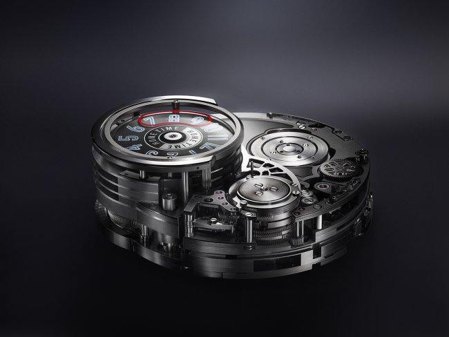 表款搭载的手上鍊机芯零件数达1066枚,可见其为了呈现外在的互动显时乐趣,需要透过精密度倍增的结构来实现,特别注意其机芯厚度达17mm,这是因为空间用来层叠功能库以及偏心小时盘的关系。同时制表师为了保护机芯免受点唱机不断更换唱片需要消耗大量动力,因而特别架设了两组独立动力储存系统,负责正常走时机制的动储保有68小时动储空间,另一组则是专为副功能移动显示盘而设,至多能够确保显示盘五次来回转换无虞。