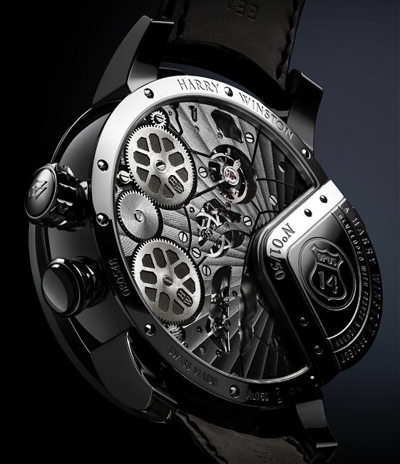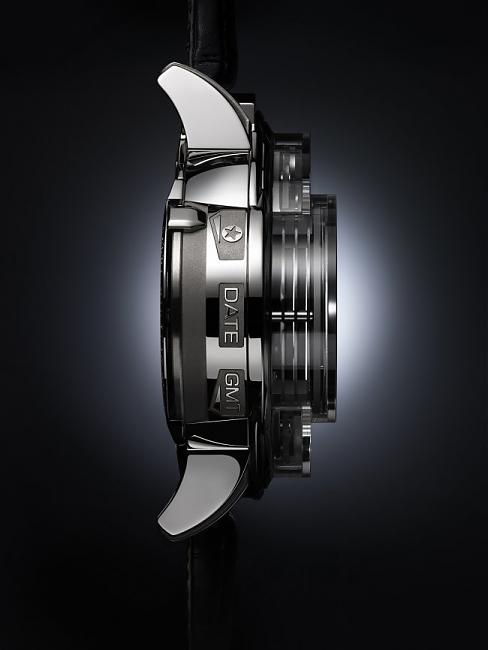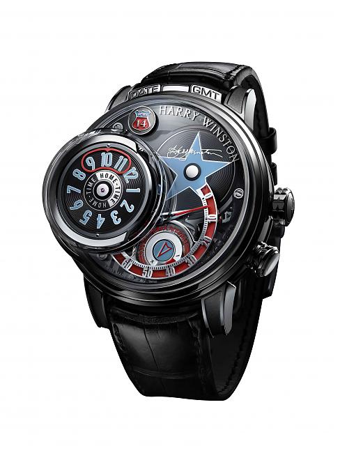 18K白金材质/HW4601手动上鍊机芯/偏心时、逆跳分显示/微缩模拟点唱机功能(海瑞温斯顿美学图腾、日期、两地时间按需显示)/动力储存显示/蓝宝石水晶镜面、透明底盖/防水30米/表径54.7x21.9mm/限量50只