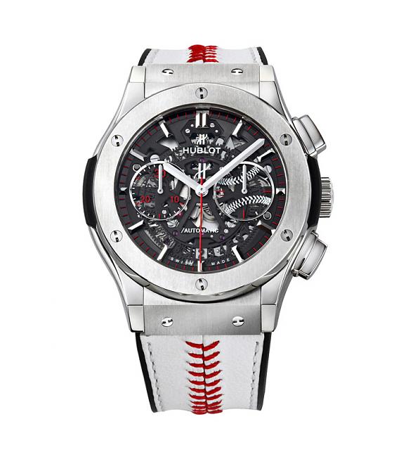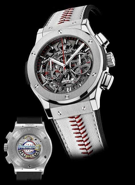 在品牌独有的时尚运动感外型下,以直径45毫米拋光或缎面拋光鈦金属面盘,搭配HUB 1155自动上鍊机芯。完全鏤空的设计理念使调校、摆轮及擒纵轮更加清晰,持续跃动的机芯更象徵球赛时扣人心弦的节奏。3点鐘位置小秒盘以棒球缝线造型呈现,表带则运用棒球红色缝线及白色小牛皮棒球材质,内衬黑色天然橡胶。为庆祝首届世界棒球12强赛的举行,表背也印上世界棒球12强赛标誌(Premier 12),纪念这世纪之战的歷史意义。此手表具备42小时动力储存和100米防水功能,全球限量100只。