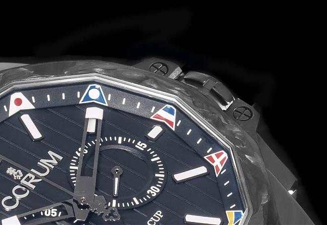 2015年CORUM崑崙开始将海军上将系列海事旗时标的顏色加回去了。2009年他们首度将海事旗改成灰阶的时候还被视为是一个大刀阔斧之举,它将系列中一个深具辨识度、却也因为经久使用而略显老态的特徵做了风格化的改款,让海军上将一下子变得时髦了起来,不过人的口味就是这样,明明是一个正确的改变,但看久了以后就又会开始怀念起旧版的设计,因此这次他们将海事旗的顏色加回来应该还是可以打动不少玩家——儘管2009年改成灰阶的时候他们也很赞成。虽然回归了原始的设计,不过新版在比例上还是有再调整,海事旗的大小维持了灰阶时期比较小的尺寸,顏色虽多却仍然保有高级感。这款黑色款除了PVD的表壳之外,表圈和表壳侧面饰板的部分採用了锻造碳,让全黑的表身在质感上多了些变化。面盘保留了同系列甲板的设计概念,不过只有直条纹的这个意象而已,材质仍然是一般的金属素材。