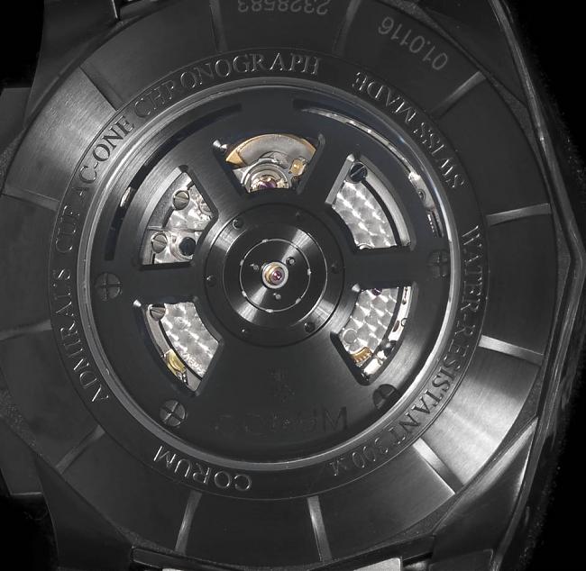 表款搭载的CO116机芯应该是ETA 2892加装计时模组而成,海军上将不常採用透明底盖,这款不但开了背,自动盘造型也相当特殊,其中的十字螺丝也算是系列的特徵元素之一。