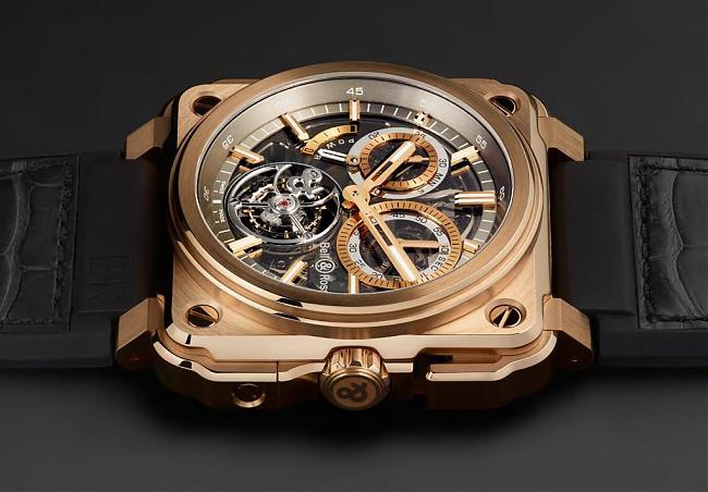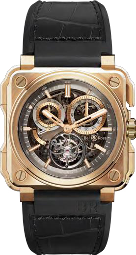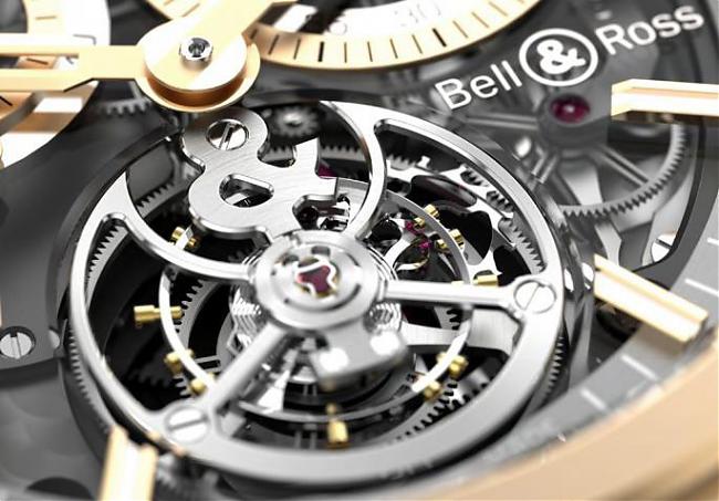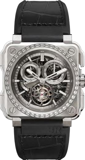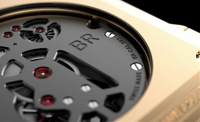 在此次新推的表款上,BELL & ROSS开发出手动上鍊鏤空式陀飞轮单按把计时机芯,此复杂机芯包含282枚零件和35颗红宝石,摆轮频率为每小时21,600次。