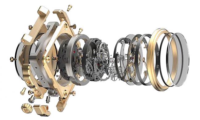 佩戴者可以看到4点位置离合器控制桿的移动以及离合器齿轮的嚙合;归零敲锤在11点和1点位置清晰可见。这枚机芯拥有导柱轮装置,在嚙合时能够使计时功能的运行更加顺畅。表款的飞行陀飞轮位于面盘6点方向,陀飞轮框架上还饰有代表品牌的"&"符号。