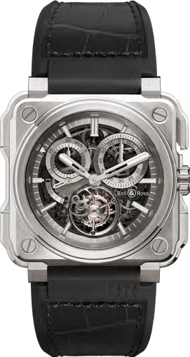 承袭BELL & ROSS既尊重鐘表传统又大胆进行技术创新的理念,BR-X1陀飞轮计时码表的机芯和表壳修饰遵守高级鐘表的制作准则。精雕细琢:磨砂和拋光倒角边缘、拋光、纹饰;计时码表桥板和陀飞轮框架採用釕金属制成。