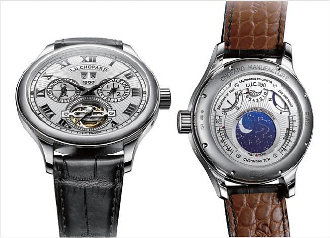 例如萧邦2010 年欢庆150 週年时,推出集结品牌歷年制表功力大成的L.U.C 150 All in One 就是将陀飞轮、万年历、时间等式、动力储存与日出日落时间(从时间等式衍生而来,因日出日落时间点受经纬度方位离太阳极点的对应距离不同,而进一步发展的显示功用)及星空月相图等多元复杂功能一次集结,甚至因为表面空间有限,必须将部分功能挪至表背才能容纳得下;此外江诗丹顿2005 年为庆祝其创立250 週年所推出的PatrimonyTraditionnelle 系列腕表中也有一款类似意义、集合多重复杂结构的高复杂杰作。至于ZENITH 的时间等式功能,则曾经与品牌着名的陀螺仪共谱复杂极限。