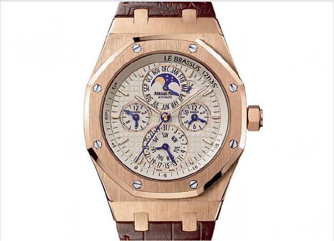 这款皇家橡树系列腕表为使面盘不致过于拥挤,而将时间等式刻度设在面盘外缘4 ∼ 10 时位置。