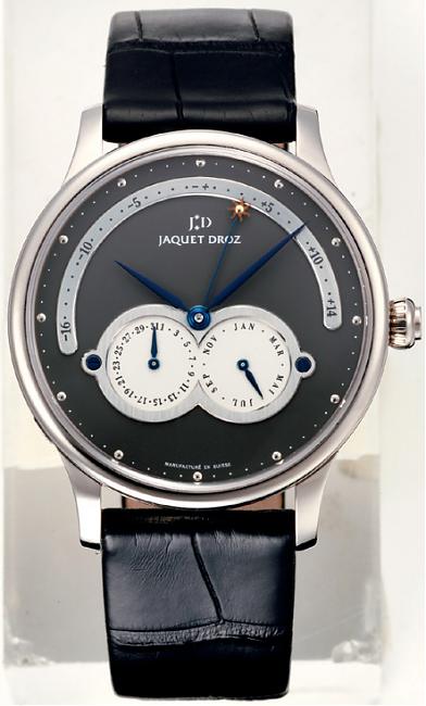 表款以不对称的陈列方式将年历功能散布面盘各处,而天文时差显示则设置于4 ∼ 5 时位置。