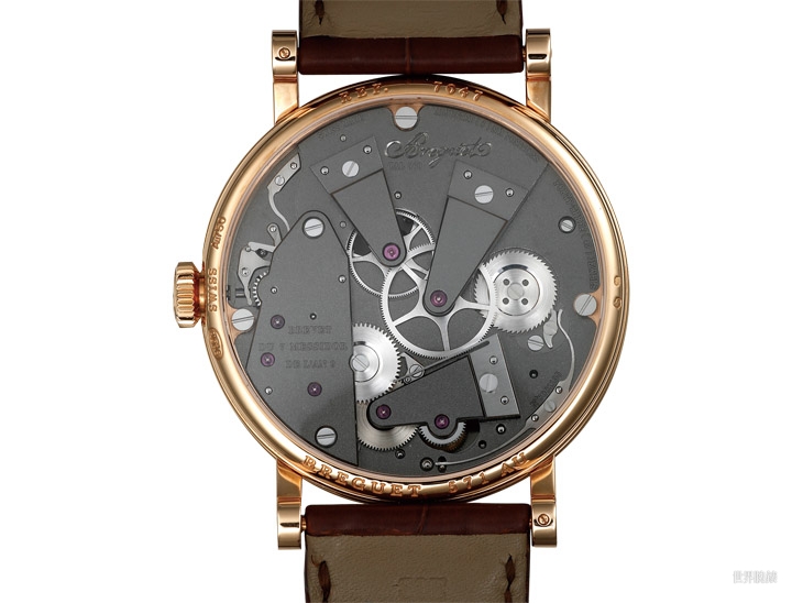 有别于其他几款Tradition,7047的轮系主要是从背面(表背侧)走的,虽然动力部与擒纵部都在正面,但也许是这两块佔去太多空间,因此中间连结两者的走时轮系都配置在背面。