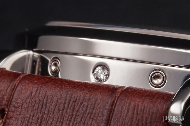 ▲一本PP的惯例,铂金款式都会在下表耳间6点钟位置的表壳镶上一颗单钻,低调至极,而这款的话单钻两旁还多了万年历的隐藏式快调按把。