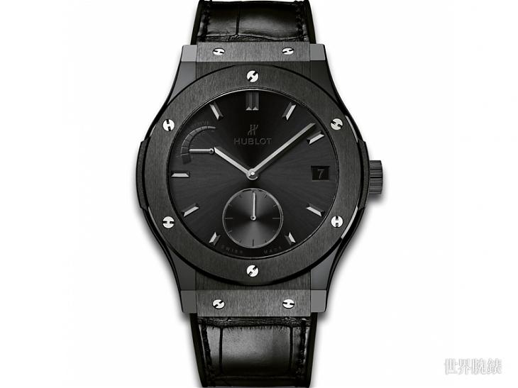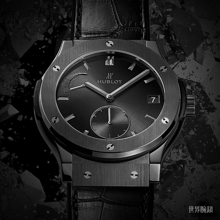 宇舶经典融合系列8日动力储存全黑腕表以45毫米黑色陶瓷表壳精制而成,儘管造型更加修长,但依然结实坚固,适合每一个场合佩戴。在表圈部份,它镶有6个H型鈦金属螺丝,让整只表款的设计更加活泼的同时也多了几分阳刚之气。