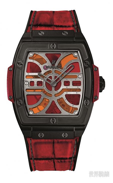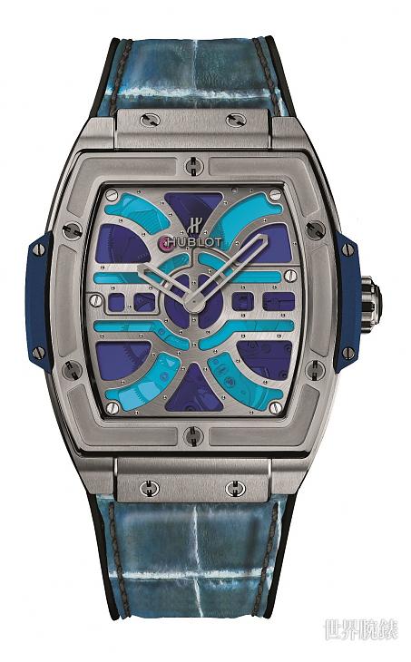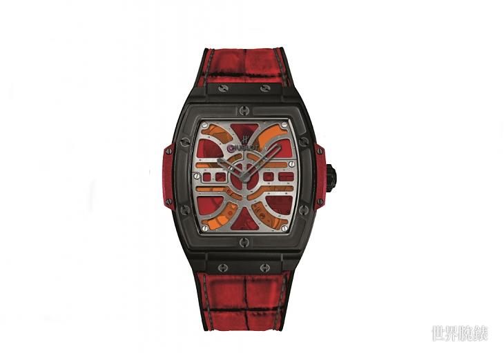 ▲宇舶炫彩镶嵌玻璃表,有着酒桶型表壳和鏤空表盘,加上千年的玻璃镶嵌工艺,清澈鲜艳,这款是由陶瓷材质打造而成