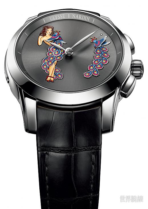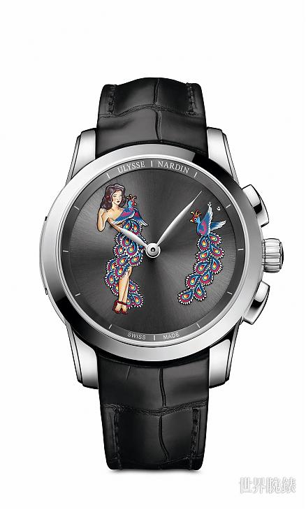 此次雅典表推出《舞孃单问报时限量表》将美女Pin-Up在腕间,美艳迷人的舞孃在髮际簪上一朵红花,脚踏性感的高跟凉鞋,眼神充满魅惑挑逗,迷人的姿态在色彩繽纷的孔雀羽毛下若隐若现。这些都是雅典表的微绘画师,以极细的画笔在面盘上直接做画,细腻的笔触与鲜艳大胆的用色,勾勒出舞孃与孔雀活灵活现的细节。