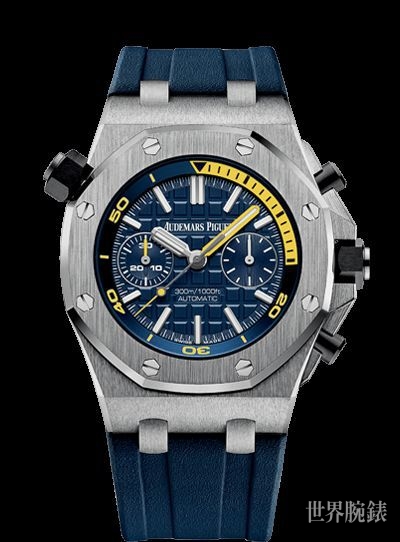 爱彼(AUDEMARS PIGUET)皇家橡树离岸型潜水计时表,蓝色表盘中点缀着黄色细节展现清新的设计和有趣的功能。这只潜水计时表彷彿能戴着佩戴者潜入充满趣味的天地,而且它那新颖的设计元素更是赋予这只计时表别具一格的特色。