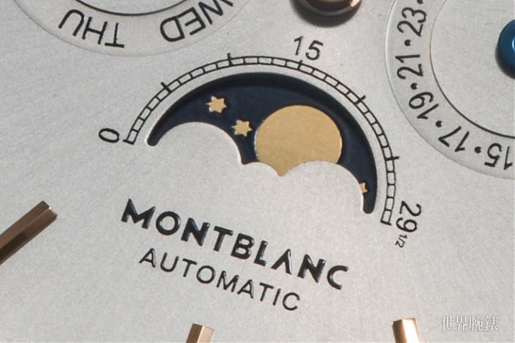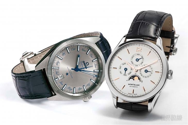 万宝龙自己是在发表平价万年历的隔年推出年历表的,一开始是先出了限量的达伽马纪念版,稍晚才加入了一般版本。纪念版和一般版的差别主要在月相,纪念版在整个面盘的下半部开了一块深蓝色的圆形夜空,月相则是在中央开了一个洞孔表示,相对地一般版就是寻常的伞形窗;就笔者个人偏好是比较喜欢古典的伞形窗的,但就算持平来说纪念版的月相也还有另一个问题,因为儘管显示形式不同,但两款採用的基本上还是同一枚机芯,所差者在于一般版的机制是月亮动、月影(伞形窗突起的两个半圆)不动,纪念版则正好相反,再配合到圆形夜空的设计,导致最后整个月相显示区的位置比起整体的格局来说低了很多,相形之下还是一般版的配置更为平均。