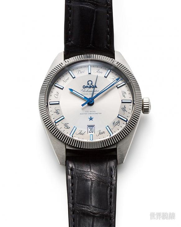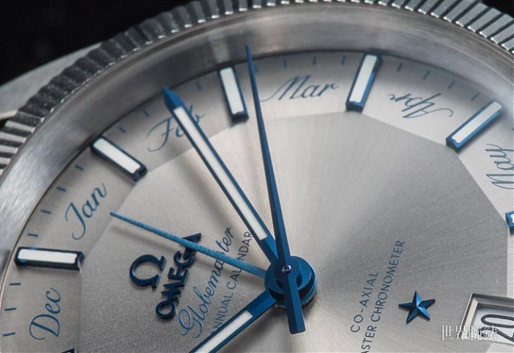 事实上利用中央指针搭配表面12分割的特性来表示月份并非OMEGA首创,从最早的HENRY MOSER到其他对手品牌都使用过类似的做法,而OMEGA跟他们最大的不同在于其他的例子都是直接用时标借代月份,但Globemaster却是利用了时标跟时标之间的空间,大同而小异,只是这麼一来又带出了另一个问题。用时标借代月份的好处在于直觉,5点鐘就是五月,不需要多加思索,因此前面提到的几个例子都没有在时标旁另行标注月份,相对地OMEGA的做法就有可能造成混淆(比如说5点跟6点之间的位置该算是几月可能就得想一下),因此表款必须在12个切面上逐一註明月份,而这点也成了表款的又一个特徵。