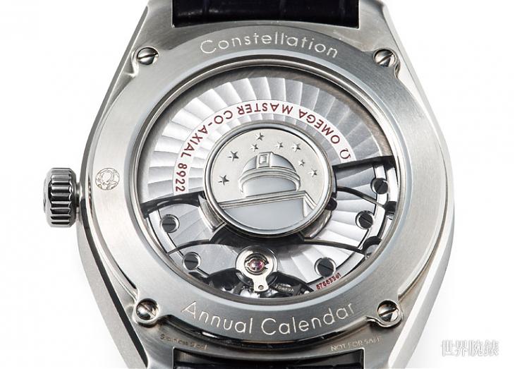 ▲OMEGA原本的年历机芯是8601,导入了Master Co-axial的版本是8902,这款由于将视窗式的月份改成了中央指针,因此型号又变成了8922。透明底盖中央的天文台金属牌是Globemaster的一大特徵。