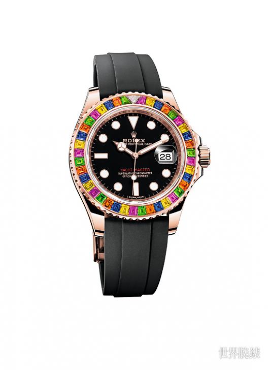劳力士推出新款Oyster Perpetual Yacht-Master 40(游艇名仕型40)。这款经典的航海表首次以镶宝石款亮相,繽纷的游艇实在让人看了心动不已!劳力士全新游艇是以18ct永恆玫瑰金铸造,搭配亮面黑色面盘,双向旋转刻度外圈则密镶彩色宝石和碧绿榴石,呈现更加繽纷的视觉效果。12 点位置还镶嵌了一颗叁角形钻石,连奢华度都照顾到了。劳力士Oyster Perpetual Yacht-Master 40的防水、精确、可靠都体现了劳力士从上世纪五○年代以来与航海事业结下的不解之缘。另外,这款腕表还特别配备劳力士研发与拥有专利的创新Oysterflex橡胶表带。