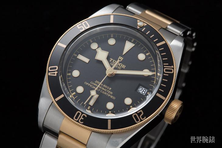 TUDOR的主力Black Bay系列,因为老大哥劳力士的关系,所以有时候会不小心让刚入门的表迷误会,以为是劳力士本尊,但其实TUDOR和劳力士虽然密不可分,实际上这几年TUDOR越来越有自己的味道,除了前几年所做的玫瑰Logo复古设计外,招牌的雪花针搭配几何时标的做法,也是让人印象深刻的DNA,尤其六点钟位置所做的防水深度与认证标记,更是在自家面盘上增加了不少细节化的质感,搭配十二点钟位置的盾牌Logo,老实说现在越来越多表迷是为了TUDOR自家的年轻、复古设计而来,因为这比例稍微掌握不好就很容易变得老气,可是半金款所融入的处理并不会让人觉得如此,这或许就是Black Bay原有的复古DNA所夹带而来的加分作用!