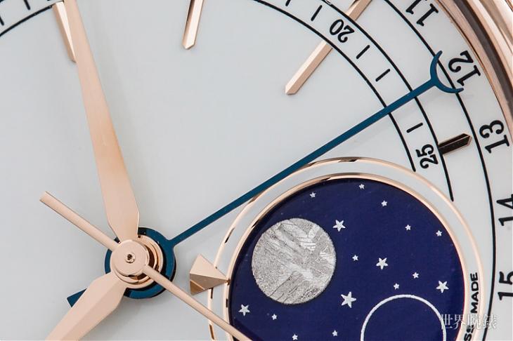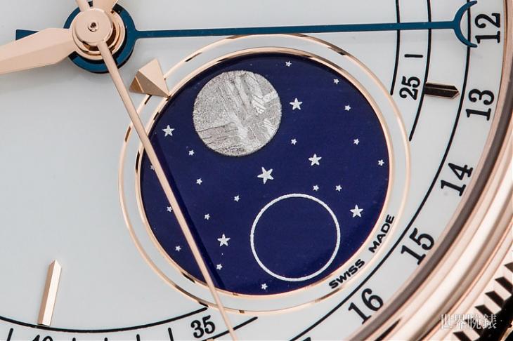 ▲位于六点钟位置的月相,分别以陨石材质象徵满月,而以银环表示新月,素净的白面上融入夺人耳目的蓝色珐琅,月相表使用这两种材质的搭配也是劳少见的设计!