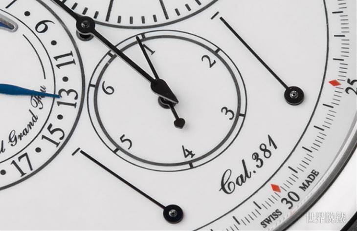 18K白金材质/381手动上鍊机芯/偏心时、偏心分、秒、日期显示/瞬跳秒针带停秒和归零功能/月相显示/动力储存显示/蓝宝石水晶镜面、透明底盖/表径40.5mm/参考价:NT$ 1,950,000
