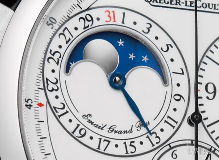 首款Duomètre à Quantième Lunaire表径为42mm,后来推出尺寸较小的40.5mm款式,也将前者在动力储存位置上的鏤空设计收起,使腕表整体看来更含蓄雅致;而在2014年的S.I.H.H.上,积家再带来换上新装的Duomètre à Quantième Lunaire,尺寸同样维持在40.5mm,但月相盘的显示却更为简洁,月龄和月相周期刻度被藏了起来,原本鐫刻穗饰纹的面盘换成了大明火珐琅,无瑕明净,与18K白金表壳正好相配,这次的改款明显朝更典雅的方向走,更能配合月相的优雅特质,也更大程度地展现积家在各方工艺上的实力。