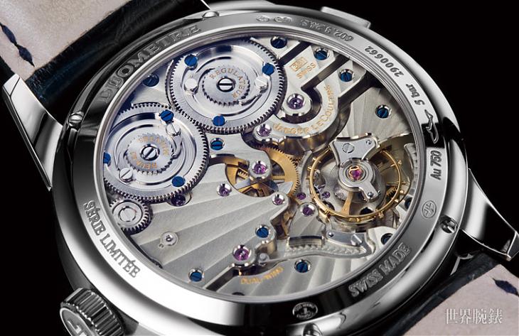 Duomètre à Chronographe就是Duomètre系列的第一款腕表;Duomètre à Quantième Lunaire则在'10年面世,381机芯内是两个各自具备50小时动力储存的发条盒,一个为时、分、秒、日期和月相提供动力,另一个则完全为擒纵机构供应动力,确保走时的精确。