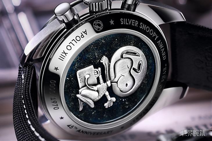 这款腕表的表背设计独显匠心,饶富特色,防磨损蓝宝石水晶镜面保护着925纯银徽章,令人想到1970年颁赠予欧米茄那枚「银史努比奖」的附随别针。纯银制作的史诺比镶嵌在一块缀有深蓝色搪瓷饰边的银片上,每只腕表的表背均以人手洒上银粉,营造史诺比在太空飘浮的效果。不锈钢表背鐫刻黑色字样”SILVER SNOOPY AWARD”、”EYES ON THE STARS”、“45TH ANNIVERSARY”、限量编号”0000/1970”及”APOLLO XIII”。